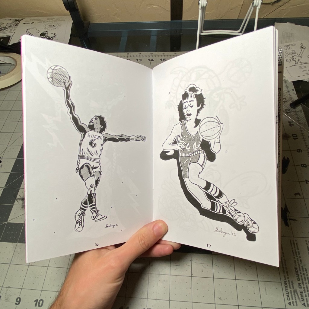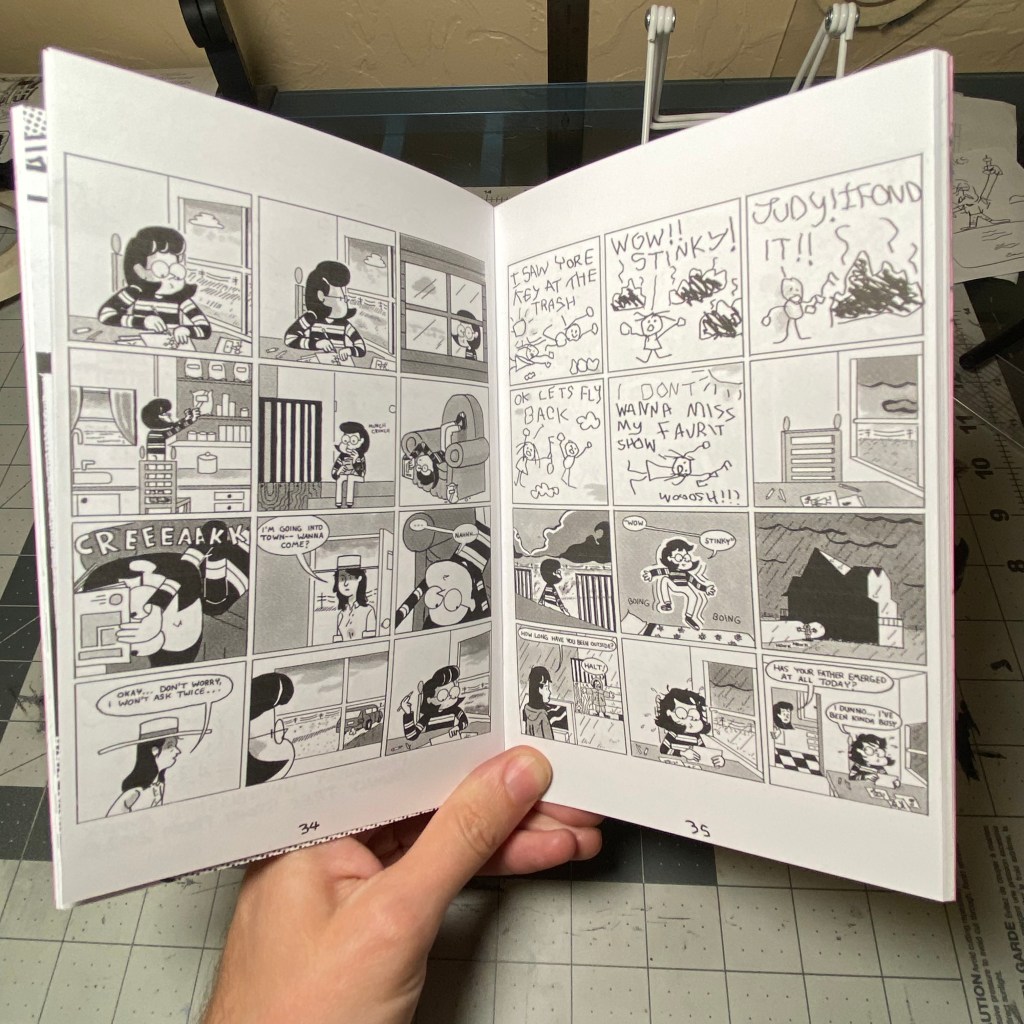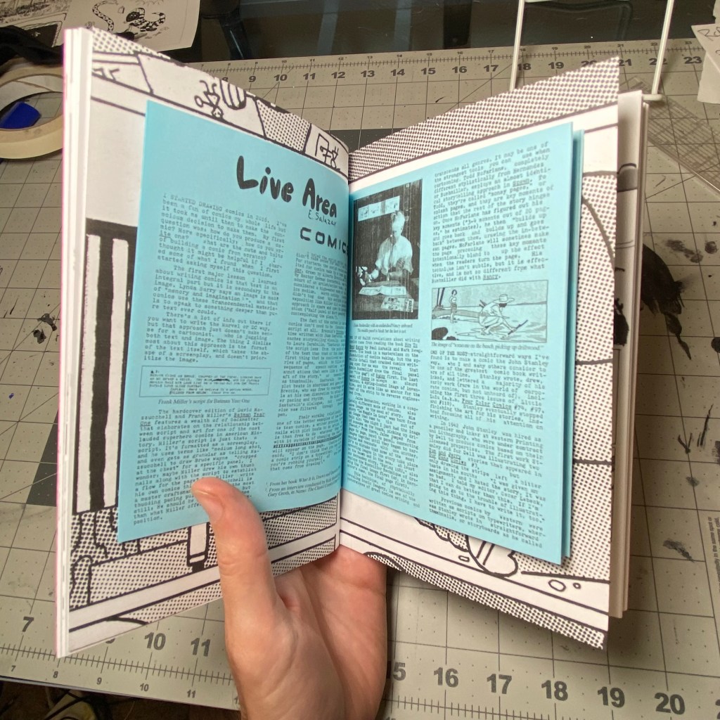 PLUS! Nestled inside the centerfold is the 16 page mini-zine LIVE AREA collecting small press comic reviews written between 2021-2022 and the essay “On Writing Comics.” That’s 80 pages of content, printed on high quality paper with card stock covers!