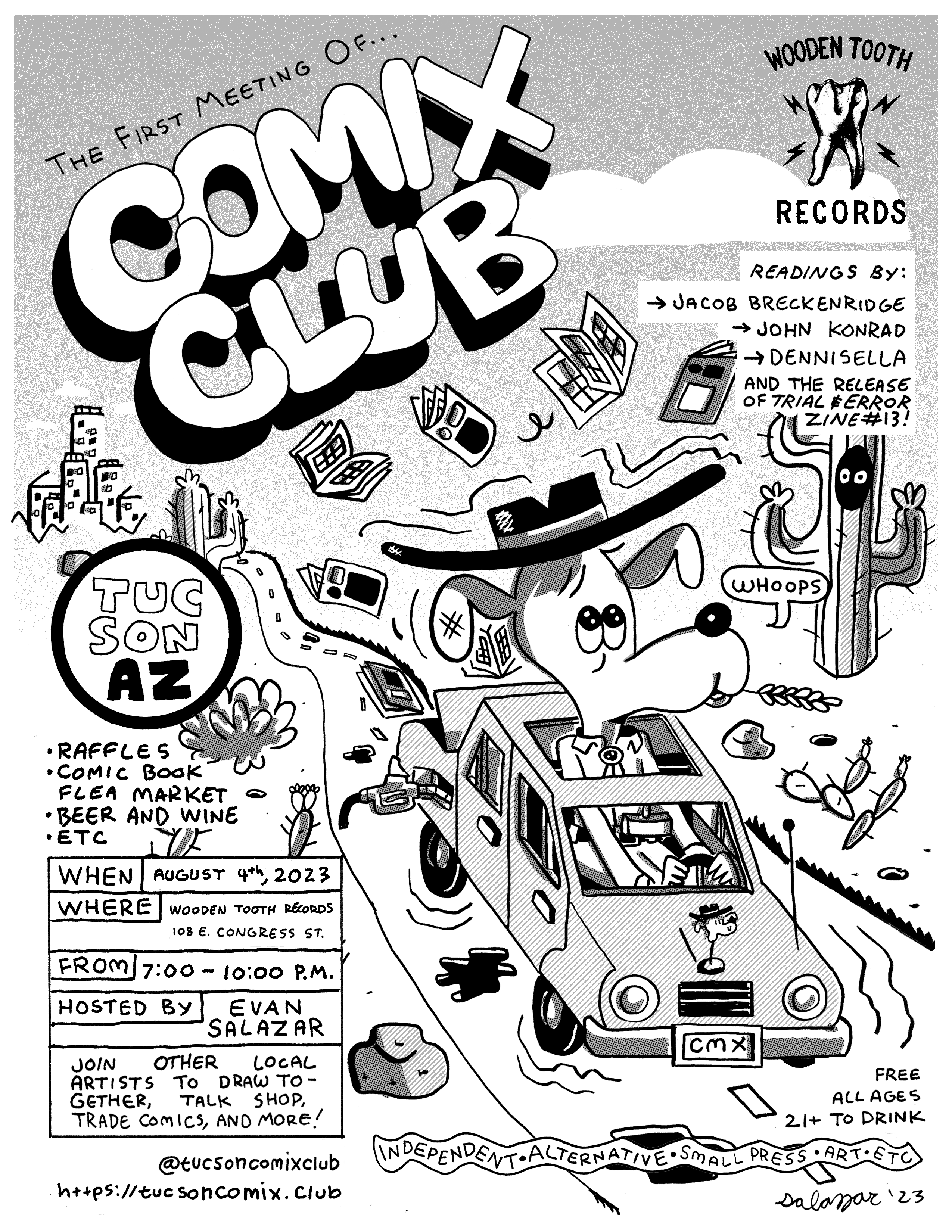 The inaugural session of the Southwest’s soon-to-be Premier Alternative Comics Meet-Up Extravaganza Spectacular COMIX CLUB will be held August 4th, 2023 at the Congress St. location of Wooden Tooth Records in sunny Tucson, AZ. Cartoonists, artists, zinesters, readers, newcomers, or the simply curious are invited to attend — all are welcome.